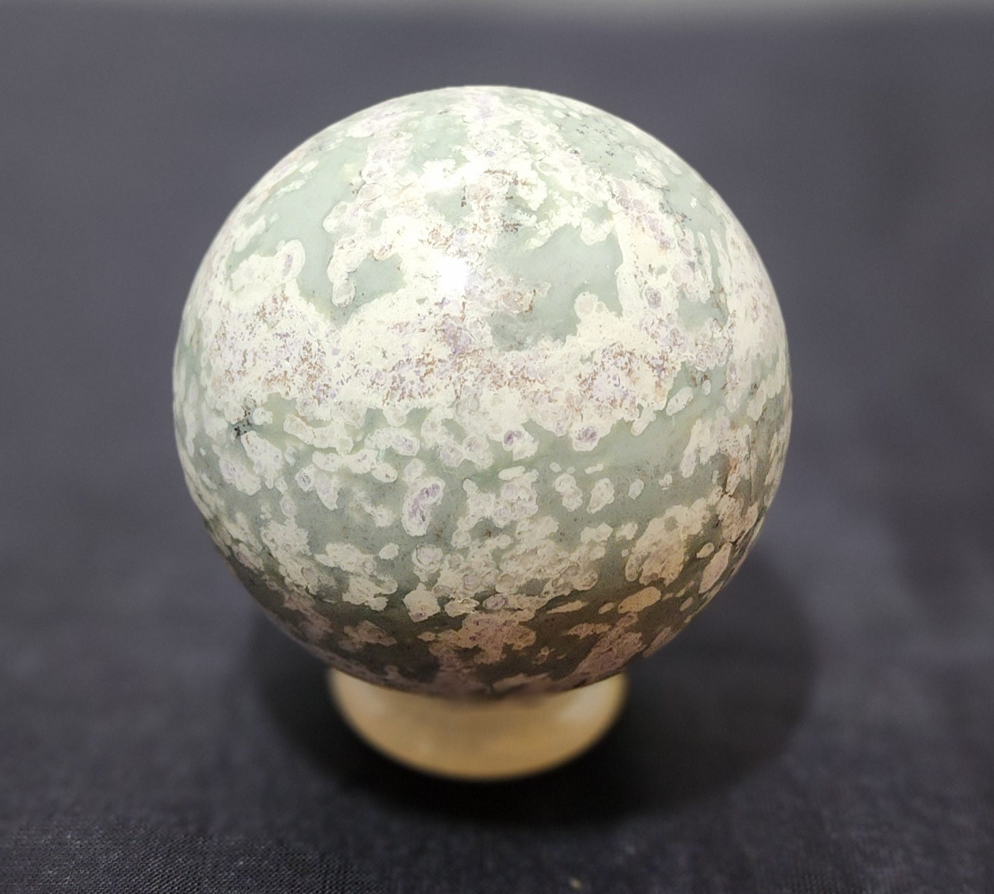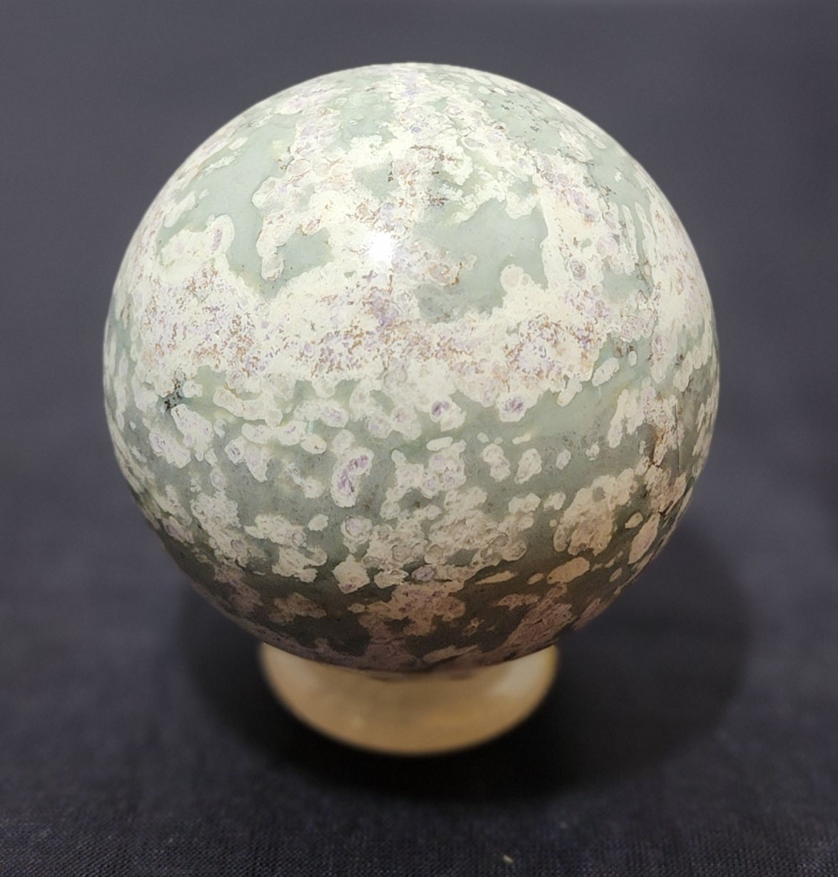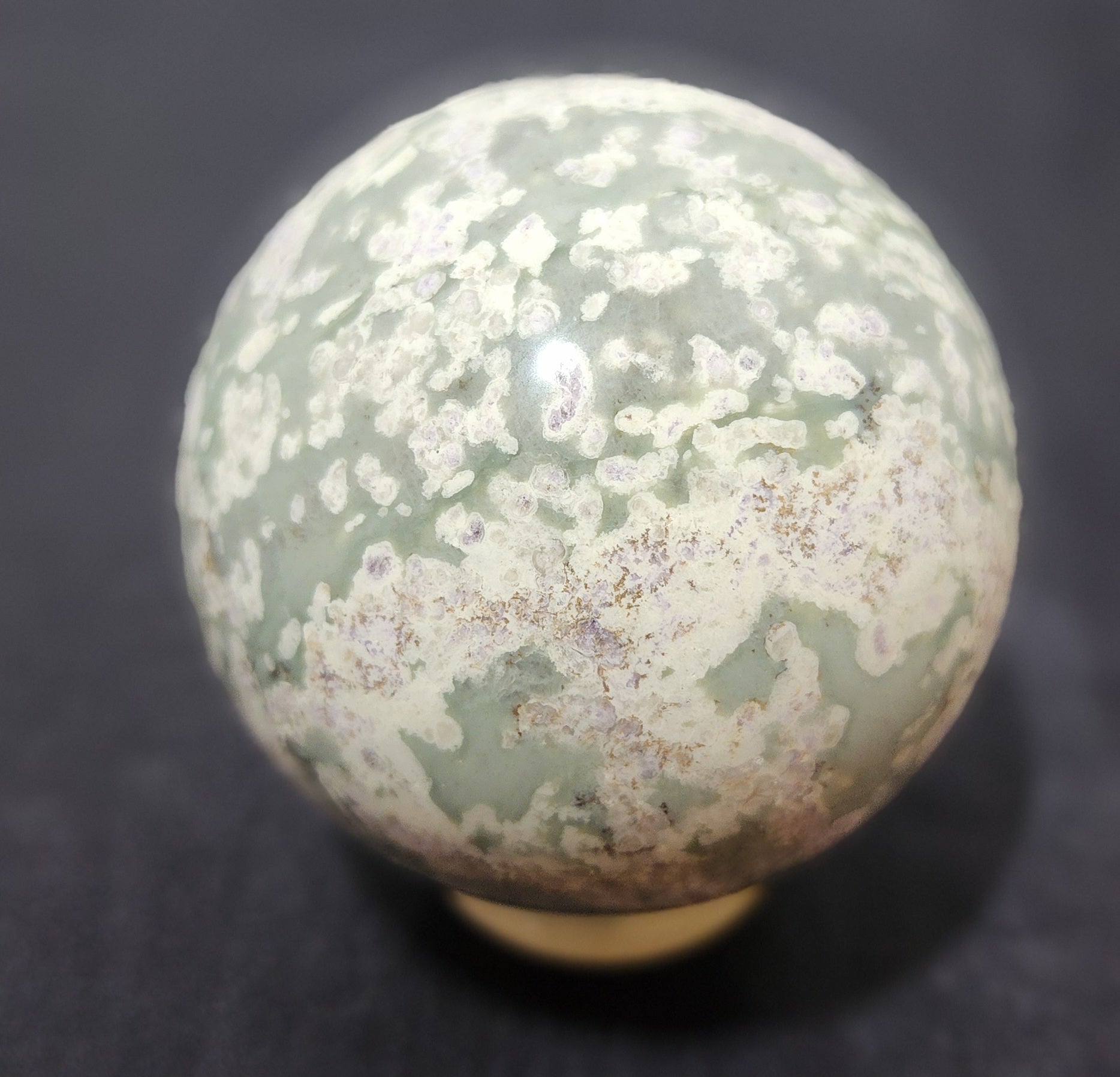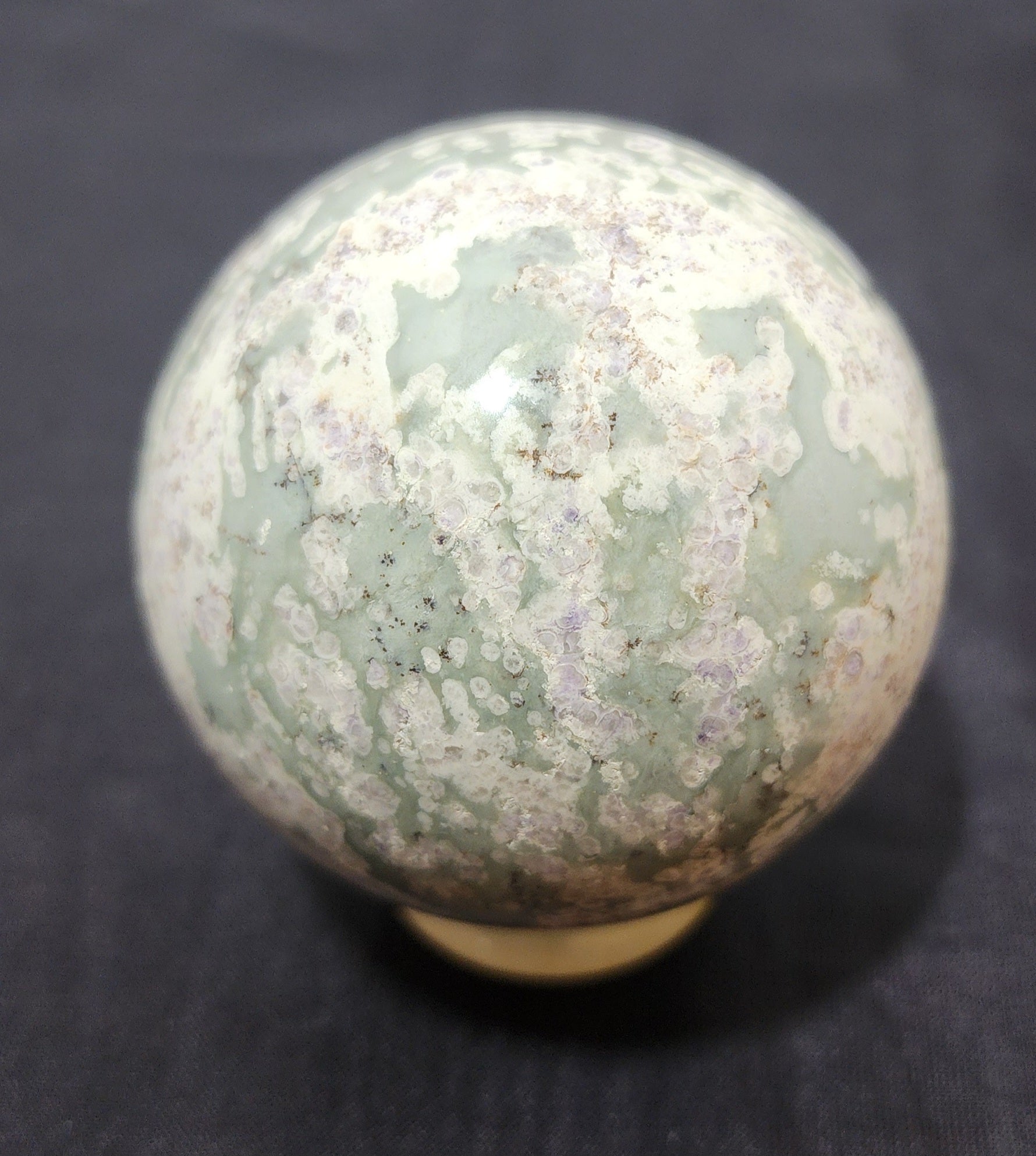 Lovely white sphere adorned with splashes of green and sprinkles of sparkling purple. Measures 62 mm