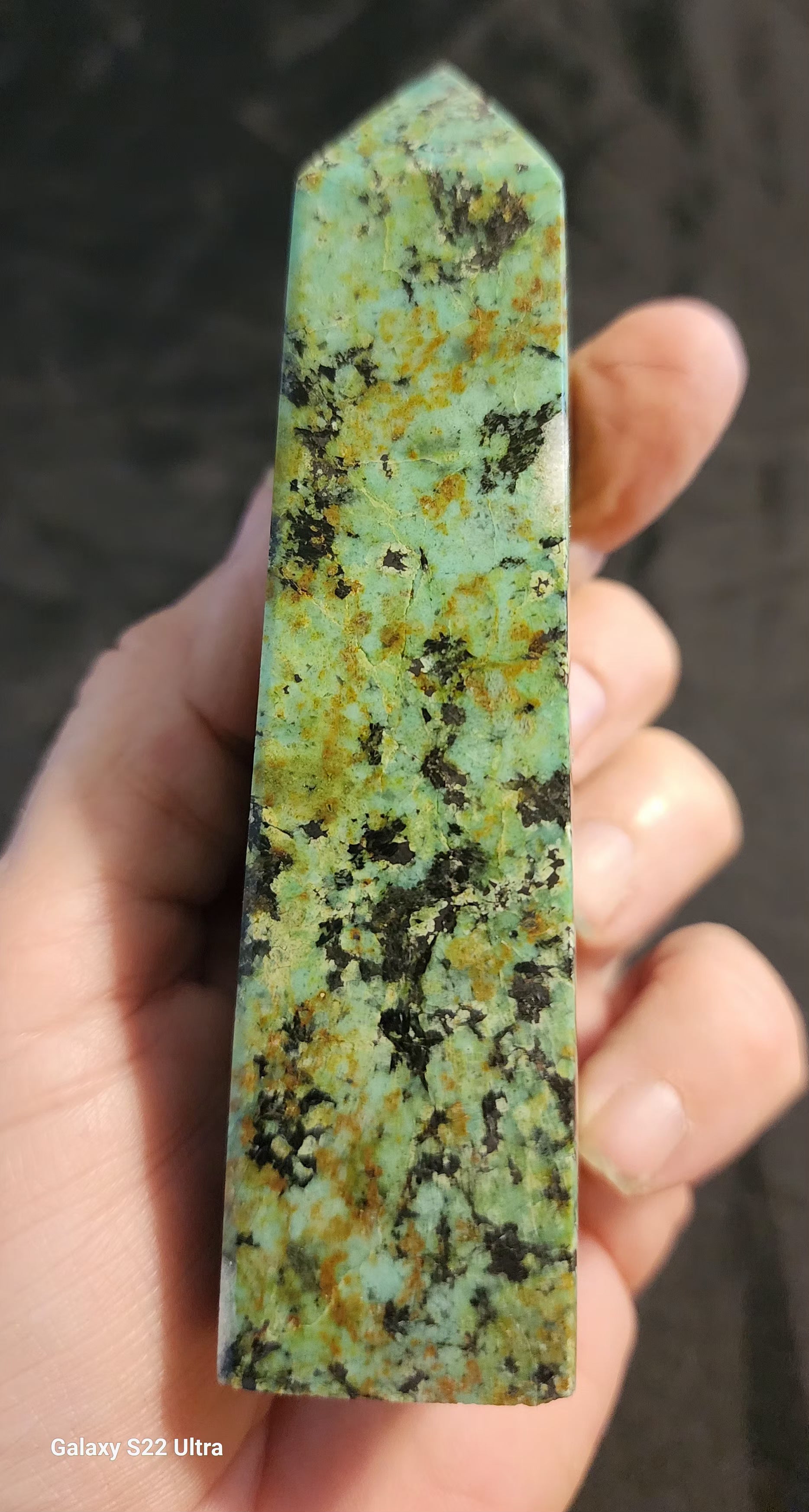 Experience the natural, earthy beauty of our Green Mexican Turquoise tower. Each piece features stunning green turquoise with subtle glimmers of pyrite, creating a unique and captivating aesthetic. Let this powerful stone awaken your senses and bring a sense of grounding and balance into your life.