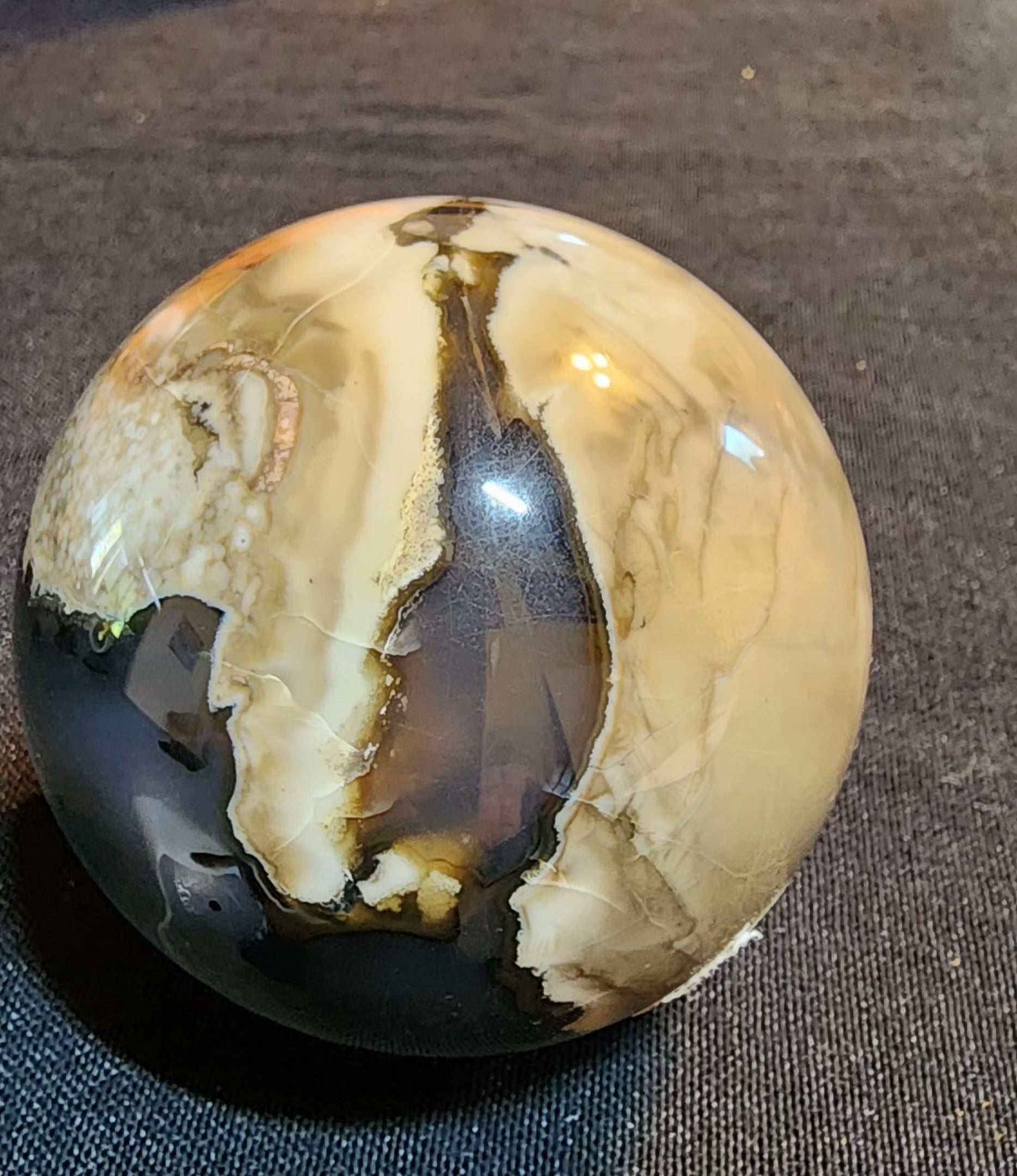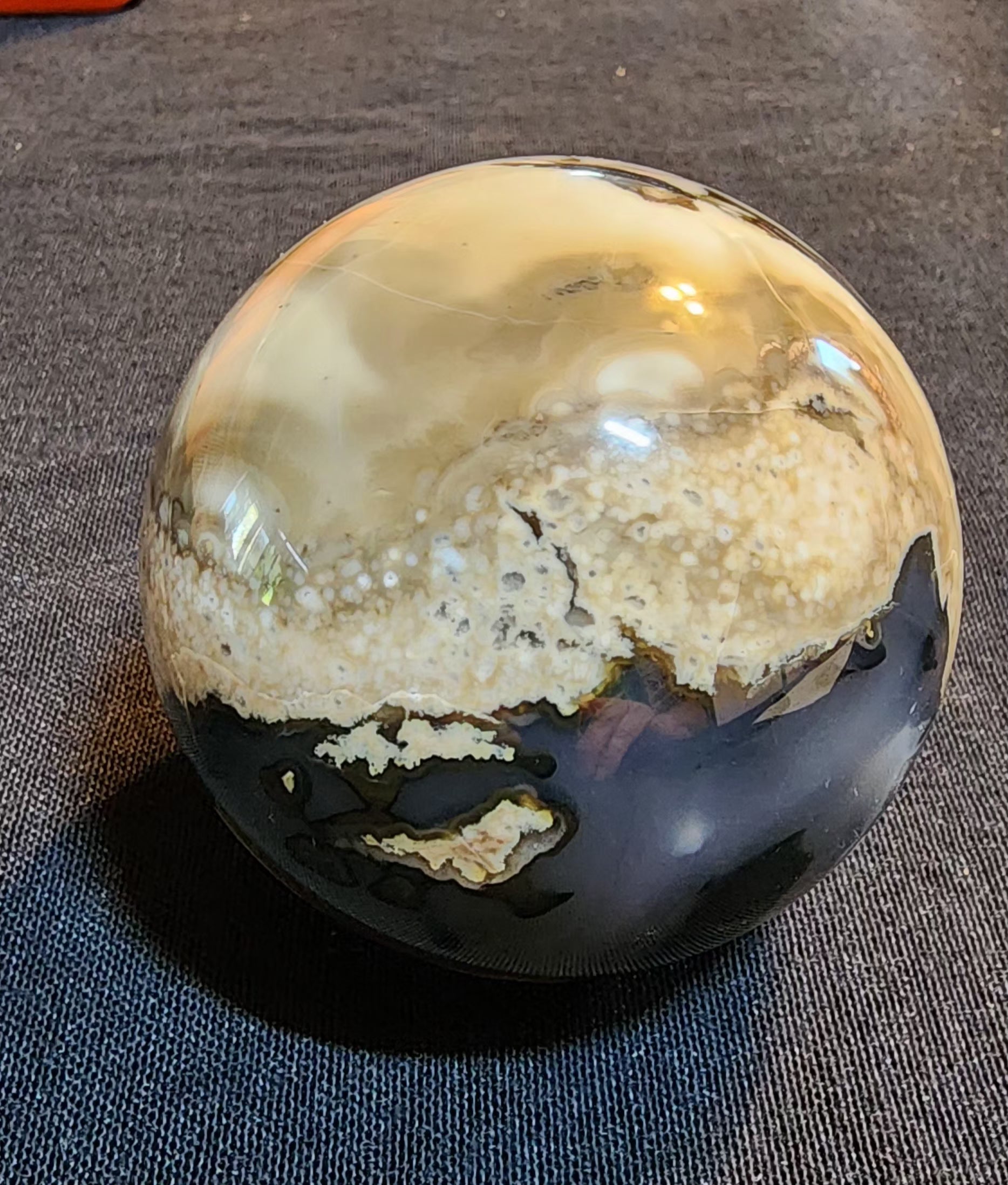 This sphere has beautiful blues, browns and cream tones and is uv reactive turning some of the intricate patterns a gorgeous emerald green!